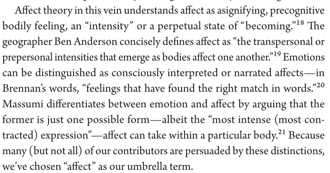 Such cultural theorists as Brian Massumi and Kathleen Stewart align their work with a Spinozist definition of affect to conceive of it as “virtual” and “autonomous,” co-produced by contingent and shifty assemblages.