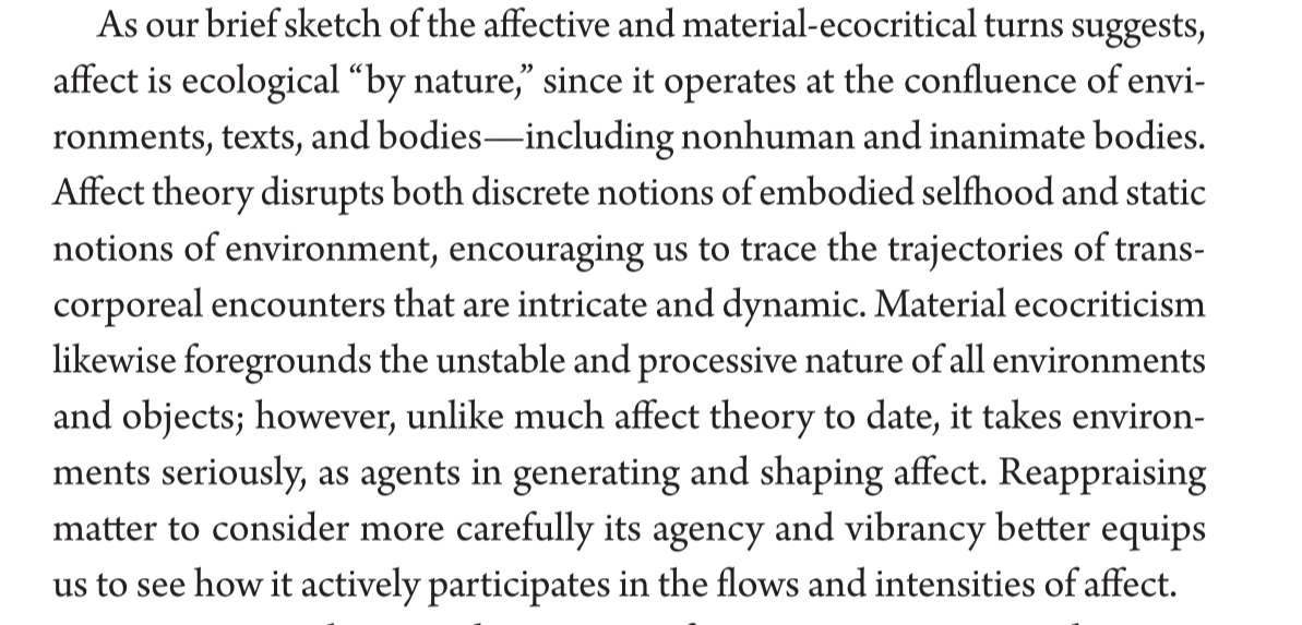 情感理论强调:情感本质上是生态的,因为它在环境、文本和身体(包括非人类和无生命的身体)的互动中起作用。情感理论打破了具身自我的分离概念(身体和心灵二分的观念)和环境的静态概念,强调追踪复杂而动态的跨躯体接触的轨迹(the trajectories of transcorporeal encounters,如人类和环境/动物/物之间的跨躯体性,要求环境或物有能动性)。物质生态批评同样强调了所有环境和物体的不稳定性和进步性(两者都强调主体 - 情感和自然 - 必须同时被理解为物质和意识形态),标志着情感理论和生态批评理论结合起来的时机。