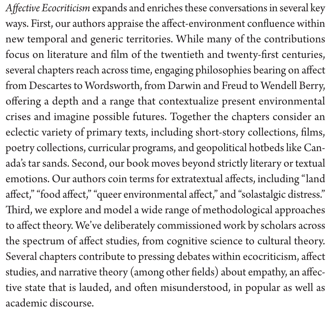 - Lisa Ottum and Seth T. Reno’s Wordsworth and the Green Romantics: Affect and Ecology in the Nineteenth Century, like our collection, puts affect theory and ecocriticism into conversation, and we share its premise that “a wide range of affective experiences and literary emotions are potentially ‘green.’”