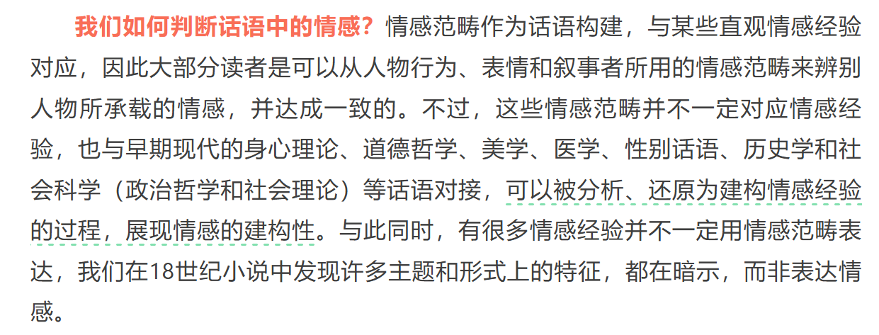 - 情感征兆:文学作品经常对人物的行为举止进行描绘,也会通过内心独白和心理转述等手段描绘内心活动,但不直接使用表示情感范畴的词汇来对人物的情感状态加以揭示。与此同时,有很多情感状态是复合而模糊的,可能是有意识情感和无意识情感叠加和交织而成的。这时候,读者只能以文本中包含的线索和征兆为依据推测人物的情感状态。